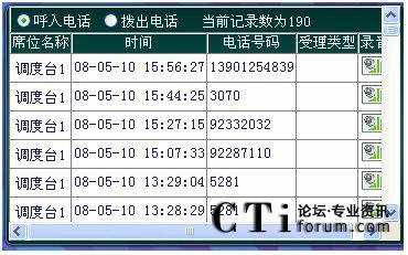 當電話打進來,話務員提話機時系統(tǒng)便自動進行錄音,系統(tǒng)把語音信號以數(shù)字化語音格式寫入硬盤。同時系統(tǒng)記錄其通話日期、摘機時間、掛機時間和當前通話時間等信息,如果該次電話為打出電話,還可記錄其打出的電話號碼。當值班人員掛機時系統(tǒng)便會自動停止錄音。