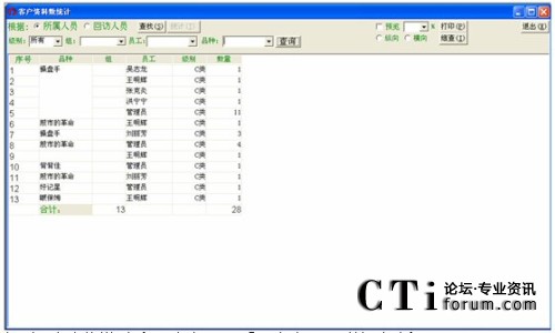 統(tǒng)計方式中含5種查詢方式:時間段、員工、產(chǎn)品、銷售、區(qū)域,可按這幾種方式進行進線銷售統(tǒng)計。