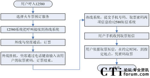1、用戶通過(guò)手機(jī)電話訂票,首先進(jìn)入12580系統(tǒng),在12580系統(tǒng)中選擇訂票服務(wù),12580系統(tǒng)通過(guò)與訂票熱線的語(yǔ)音線路,把用戶接續(xù)到訂票熱線系統(tǒng)。