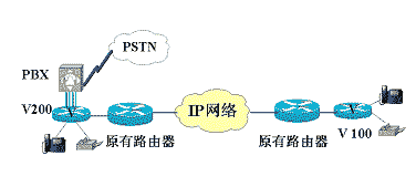 方案說明:以快速以太網(wǎng)口接入數(shù)據(jù)網(wǎng)絡,V200-2FXO接本地PBX或直接連入PSTN,V200-2FXS直接提供兩路話音接入。