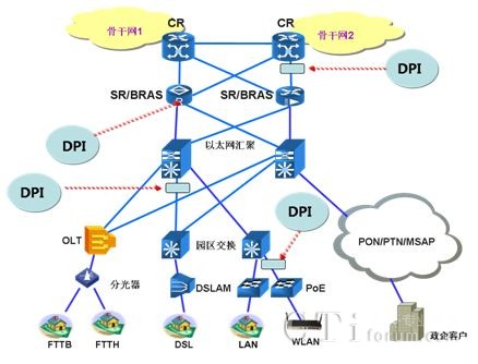 用戶身份的識別可以通過傳統(tǒng)的PPPoE和IPoE協(xié)議部分實現(xiàn),為了解終端類型、地理位置等信息,可對上述協(xié)議進(jìn)行擴(kuò)展或引入新的協(xié)議支持;對于業(yè)務(wù)類型的識別,業(yè)界普遍認(rèn)為應(yīng)通過引入深度包檢測DPI(Deep Packet Inspection)技術(shù)來實現(xiàn)。DPI設(shè)備可以多種形態(tài)和多種方式部署在網(wǎng)絡(luò)接入層或匯聚層,例如與PTN設(shè)備、城域網(wǎng)的BRAS或SR共框,或者獨(dú)立部署。