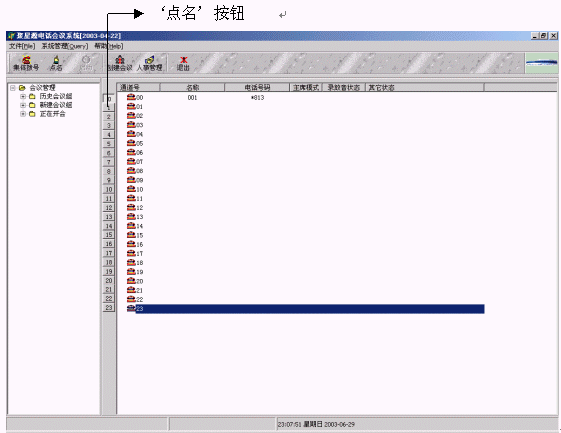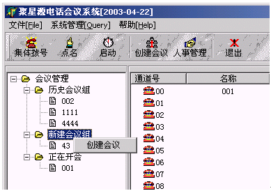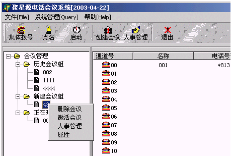 3、系統(tǒng)上方是工具欄,包括:創(chuàng)建會(huì)議、人事管理、啟動(dòng)、集體撥號(hào)、雙工/單工、點(diǎn)名、電話薄等快捷鍵。