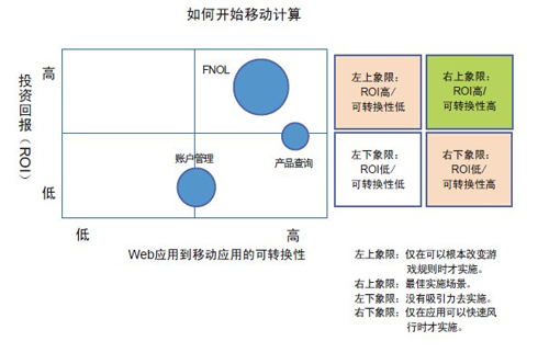 建議考察兩個(gè)基本維度:(1)第一個(gè)移動(dòng)項(xiàng)目的總投資回報(bào)(ROI)和價(jià)值主張是什么?(2)現(xiàn)有的Web應(yīng)用如何通過相對(duì)較少的努力就可以轉(zhuǎn)變成移動(dòng)應(yīng)用?在下面的圖表中這兩個(gè)維度被標(biāo)為X軸和Y軸。氣泡的大小代表投入的大小。很顯然,右上方的象限是容易摘取的果子。您選擇哪個(gè)氣泡關(guān)鍵在于您對(duì)風(fēng)險(xiǎn)的偏好以及在市場(chǎng)中成為領(lǐng)先者的渴望。