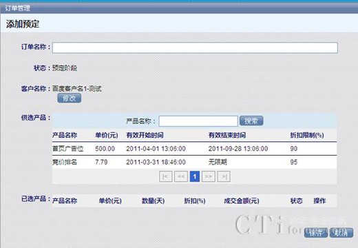 選擇訂單的名稱,供客戶選擇的產(chǎn)品,在供選產(chǎn)品列表下選擇產(chǎn)品名稱,然后所選的產(chǎn)品就會出現(xiàn)在已選產(chǎn)品列表下,完成后點擊【保存】,這樣一個訂單就生成了。