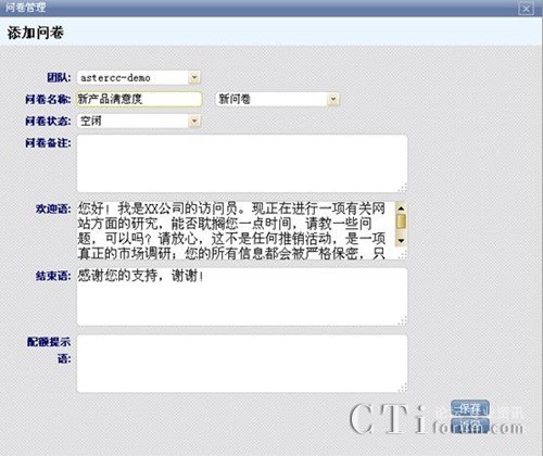添加功能用來添加新問卷,這里你可以根據(jù)業(yè)務的需要設定所需要得信息,例如問卷的歡迎語,結(jié)束語,配額提示語等信息,自定義輸入信息。