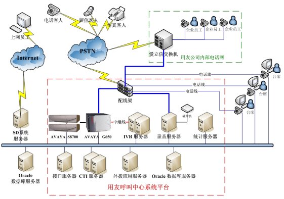 - 完善的業(yè)務系統(tǒng)整合能力:通過與用友的后臺SD業(yè)務系統(tǒng)的集成,實現(xiàn)了接入系統(tǒng)與后臺業(yè)務系統(tǒng)的數(shù)據(jù)共享,使得前臺呼叫中心接入與后臺SD業(yè)務系統(tǒng)數(shù)據(jù)處理,形成了客戶、服務單、錄音等數(shù)據(jù)的關聯(lián),組成了完整的信息流轉體系,從而保障用友客戶服務中心客戶信息的高度的一致性和高效性;