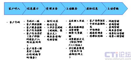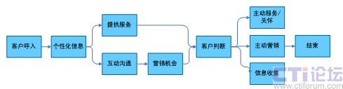 在上面的流程中,將一次客戶接觸,轉(zhuǎn)變?yōu)橐淮稳娴目蛻艋?dòng)機(jī)會(huì),通過對客戶信息360度的洞察和客戶的互動(dòng)溝通,在為客戶提供基本服務(wù)的同時(shí),根據(jù)客戶的基本資料、歷史消費(fèi)數(shù)據(jù)等,挖掘客戶的隱性需求,從而有選擇的開展客戶關(guān)懷、客戶信息收集、客戶維系、主動(dòng)營銷活動(dòng)。下面以一個(gè)電信運(yùn)營商的客戶呼入流程為例,說明在一個(gè)以客戶為中心的客戶接觸流程中,坐席代表可以開展的客戶接觸活動(dòng)(圖4)。