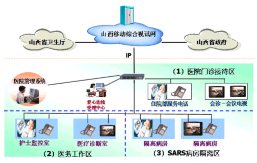 。。山西移動通信公司在獲悉遠(yuǎn)程視訊業(yè)務(wù)可以有效預(yù)防SARS的情況下,隨即與山西省政府、省衛(wèi)生廳通電話,表達(dá)了山西移動愿意為山西防治SARS工作提供更先進(jìn)的通信技術(shù)支持。山西移動與華為技術(shù)有限公司旋即制定了“愛心連線”遠(yuǎn)程醫(yī)療、遠(yuǎn)程探視實施方案,省衛(wèi)生廳及下屬太原市7家醫(yī)院要求盡快實施。目前該系統(tǒng)已經(jīng)在山西省山大第一醫(yī)院開通,正值國家衛(wèi)生部SARS督察小組在山西各大醫(yī)院視察“防非”工作,整個系統(tǒng)運行穩(wěn)定,在SARS的防治工作中發(fā)揮了重要作用。
