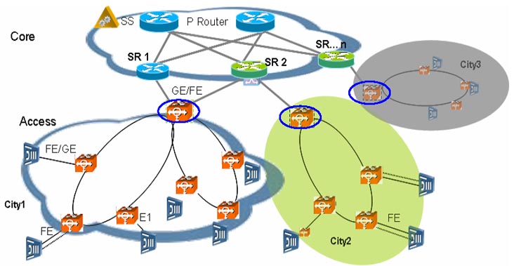 綜合接入主要關注語音和少量寬帶業(yè)務和專線,上行接口一般是E1和FE/GE。傳統(tǒng)窄帶語音業(yè)務、TDM專線等或MSAN使用于窄帶交換機組網的時候采用E1上行方式,其它時候采用FE/GE上行。接入層面采用的承載網設備必須同時能夠支持E1和FE/GE接入,因此承載網設備必須具備多業(yè)務傳輸特性,傳統(tǒng)SDH設備,傳統(tǒng)LANSwitch設備無法滿足組網需求。