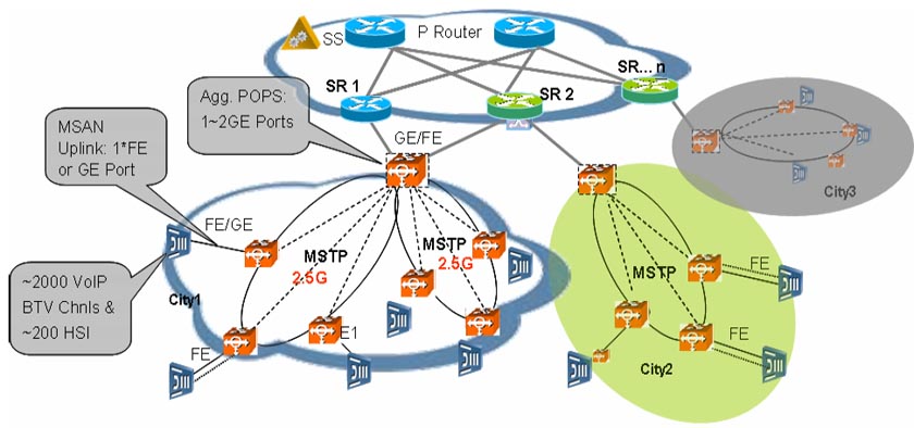MSAN已經逐漸成為基于IP架構的下一代電信網建網的主要接入方式,近幾年越來越多的固網運營商普遍采用綜合接入(MSAN)建網模式,如英國的最大固網運營商英國電信的21CN網絡,中國的最大固網運營商中國電信、中國網通,巴西的最大固網運營商Telemar等。而MSTP單一平臺具備支持MSAN接入的所有業(yè)務的承載要求,且成本最低。華為公司MSTP設備具有強大的數(shù)據(jù)接入?yún)R聚及傳送特性,并通過Metro