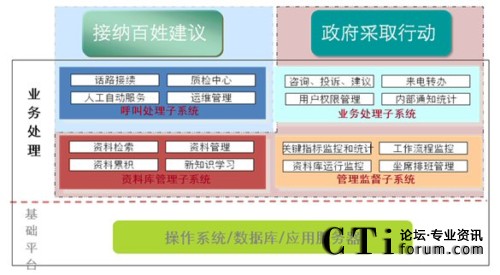 在架構(gòu)設(shè)計(jì)上,從電話接入、辦件流程、資料庫(kù)管理、信息維護(hù)到報(bào)表統(tǒng)計(jì)都實(shí)現(xiàn)了一體化設(shè)計(jì)理念。以業(yè)務(wù)流程設(shè)計(jì)為例,針對(duì)市民來電中的咨詢類的問題,12345政府熱線將直接由前臺(tái)接聽人員利用各部門預(yù)先錄入資料庫(kù)中的規(guī)范答案來回答市民的提問;對(duì)市民反映、建議、投訴類的來電,則由前臺(tái)記錄后轉(zhuǎn)給市信訪辦的后臺(tái)工作人員處理。一整套開放性的工作流和穩(wěn)定的技術(shù)后臺(tái)支持確保了市民可以在規(guī)定的時(shí)間內(nèi)得到政府的權(quán)威處理與回復(fù)。