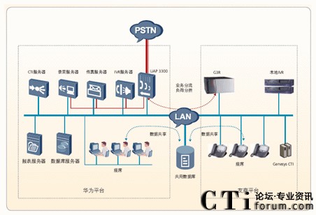 客戶電話通過PSTN統(tǒng)一由華為UAP3300排隊(duì)機(jī)接入,由華為平臺的IVR服務(wù)器進(jìn)行業(yè)務(wù)導(dǎo)航分流,根據(jù)用戶的選擇和IVR流程的配置進(jìn)行路由,可以選擇不同平臺來處理此業(yè)務(wù)。來話根據(jù)IVR流程路由后,兩個(gè)平臺采用負(fù)荷分擔(dān)方式進(jìn)行工作。在將來話導(dǎo)入兩個(gè)平臺后,采用不同設(shè)備的IVR進(jìn)行業(yè)務(wù)分配,不同平臺的座席處理不同的業(yè)務(wù)。在處理過程中,不同平臺的座席之間可以互轉(zhuǎn),達(dá)到全網(wǎng)資源共享的功能。