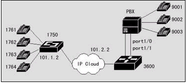 在該案例中,分部辦公室放置IP地址為10.1.1.2的DCR 1750路由器(插有二塊兩端口的FXS語(yǔ)音卡),總部辦公室放置IP地址為10.1.2.2的DCR 3660路由器(插有一塊兩端口的FXO語(yǔ)音卡),通過正確的規(guī)劃和配置可以實(shí)現(xiàn)銷售部辦公室和總部辦公室之間的IP語(yǔ)音連接。DCR 3660路由器是到達(dá)總部辦公室的主網(wǎng)點(diǎn),它需要連接到公司的PBX上,當(dāng)然,在分布也可以直接使用FXO語(yǔ)音卡和PBX直接連接,這樣在分部與總部之間可以通過IP網(wǎng)絡(luò)來?yè)艽?話費(fèi)的長(zhǎng)途電話。