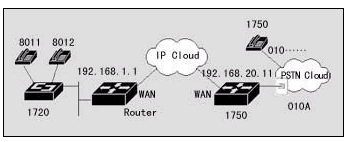 該案例中,連接到位于上海的的用戶,可以通過IP網(wǎng)絡(luò)撥打北京的PSTN用戶。位于北京的DCR 1750路由器通過 FXO接口直接連接到PSTN。假設(shè)北京可能的用戶在PSTN上的電話號(hào)碼為8位,北京的區(qū)號(hào)為010。上海的DCR 1720使用FXS端口與電話相連,北京的DCR 1750路由器使用FXO端口與PSTN上的電話端口相接,假設(shè)此端口在PSTN上的號(hào)碼為A。那么上海的用戶可以使用圖中號(hào)碼為8011(8012)的電話直接撥北京的任意電話,而北京的PSTN用戶呼叫8011(8012)電話,必須先撥號(hào)碼A,聽到二次撥號(hào)音時(shí)撥8011(8012)。在實(shí)現(xiàn)時(shí),上海的DCR 1720也可以通過器語(yǔ)音端口連接到PSTN,通過二次撥號(hào),使得兩地的PSTN用戶可以通過IP網(wǎng)絡(luò)互相通話,而話費(fèi)只是市話的費(fèi)用。