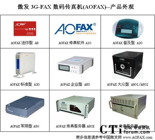 AOFAX系列電腦傳真產(chǎn)品擁有最齊全的型號,包括免費使用的AOFAX傳真軟件A10、SOHO/商旅人士便攜使用的AOFAX迷你型數(shù)碼傳真機A8、單電腦使用的AOFAX普及型數(shù)碼傳真機A20、4用戶環(huán)境的AOFAX標準型電子傳真機A30、軍警使用的AOFAX軍用型傳真系統(tǒng)A50、公安專用傳真服務(wù)器A51、營運版網(wǎng)絡(luò)傳真服務(wù)期A52、不限用戶數(shù)目的AOFAX企業(yè)型網(wǎng)絡(luò)傳真機A60、1至2線的AOFAX大眾型傳真服務(wù)器A801和A802,2至256傳真線路多種規(guī)格的AOFAX專業(yè)型傳真服務(wù)器A80X、跨區(qū)域大型公司使用的集團傳真系統(tǒng)和行業(yè)解決方案等,價格從幾百到幾十萬元,可適應(yīng)各類型客戶的需求,以下為AOFAX全系列產(chǎn)品外觀圖。