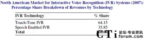 CTI論壇(ctiforum)11月3日消息(記者 楊佳林):根據(jù)Global Industry Analysts, Inc. 2010研究報(bào)告指出, 語音識(shí)別每兩年的復(fù)合成長率(CAGR)為97.7%, 其中美, 加占65%。以2007年的IVR銷售營業(yè)額而言, 具有語音識(shí)別功能的IVR系統(tǒng)已占有的1/3的比例, 顯示出語音識(shí)別系統(tǒng)已逐漸取代瀪復(fù)的IVR系統(tǒng),提供一步到位的服務(wù)。