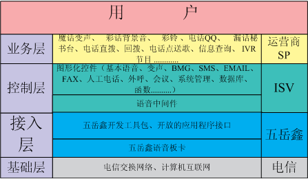 依靠五岳鑫公司強(qiáng)大的技術(shù)優(yōu)勢(shì)和對(duì)增值業(yè)務(wù)的深刻理解,以我公司自主研發(fā)的具有國際先進(jìn)水平的語音板卡為基礎(chǔ),為廣大增值業(yè)務(wù)服務(wù)商提供的語音增值業(yè)務(wù)綜合平臺(tái),將種類繁多的語音增值業(yè)務(wù)融合在一個(gè)系統(tǒng)平臺(tái)中。不僅支持行業(yè)內(nèi)大多數(shù)的語音增值業(yè)務(wù),還能方便、快速地面向市場(chǎng)提供各種的語音增值業(yè)務(wù)。