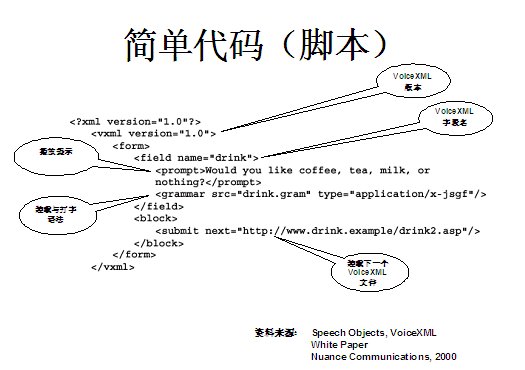 世界上最古老的用戶界面--人類語(yǔ)言終于在二十一世紀(jì)借助于VoiceXML,一種語(yǔ)音可擴(kuò)展標(biāo)記語(yǔ)言發(fā)展成熟起來(lái)。作為世界上第一個(gè)真正的語(yǔ)音通信標(biāo)準(zhǔn),它定義了應(yīng)用開(kāi)發(fā)商向用戶提供新型信息訪問(wèn)服務(wù)的方式。通過(guò)這種服務(wù),用戶在任何地方,都可以通過(guò)電話或任何移動(dòng)設(shè)備,虛擬訪問(wèn)任何信息。VoiceXML正在被廣泛應(yīng)用于旅游、金融與信息服務(wù)等行業(yè)的各種業(yè)務(wù)領(lǐng)域中,甚至是政府部門與市政機(jī)構(gòu),全球的無(wú)線運(yùn)營(yíng)商等。