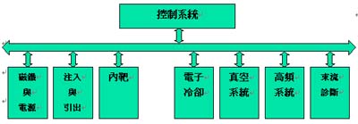 同步輻射設(shè)備以系統(tǒng)分類可分為磁鐵系統(tǒng)、電源系統(tǒng)、高頻系統(tǒng)、注入與引出系統(tǒng)、電子冷卻系統(tǒng)、內(nèi)靶系統(tǒng)、真空系統(tǒng)、束流診斷系統(tǒng)、控制系統(tǒng)、準(zhǔn)直與測量系統(tǒng)。系統(tǒng)架構(gòu)圖如下: