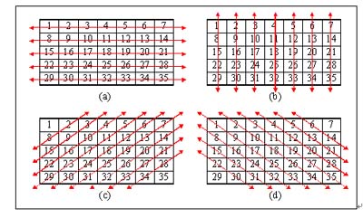 以對數(shù)據(jù)的位置重新排列方法,如圖1.1所示,假設(shè)其中的一個(gè)子圖皆為一張檔案大小5*7的圖文件,則在”位置重新排列”的方法中,其先對檔案數(shù)據(jù)作左右方向位置的調(diào)換,如圖1.1(a);再將經(jīng)過左右方向轉(zhuǎn)換的檔案數(shù)據(jù),作上下方向位置的調(diào)換,如圖1.1(b);再將經(jīng)過左右方向與上下方向轉(zhuǎn)換的檔案數(shù)據(jù),作右上左下方向位置的調(diào)換,如圖1.1(c);最后在將經(jīng)過前三個(gè)方向轉(zhuǎn)換的檔案數(shù)據(jù),作左上右下方向位置的調(diào)換,如圖1.1(d)。因此,其對于每一張圖檔都在四種方位上對數(shù)據(jù)作位置上的對調(diào),如此才完成一張圖檔的加密過程。并且在任何一個(gè)方向上,對數(shù)據(jù)作轉(zhuǎn)換的方向與點(diǎn)數(shù)都是不固定的,其完全依照隨機(jī)的方式,并有產(chǎn)生隨機(jī)方向與點(diǎn)數(shù)的機(jī)制。此種方法,僅針對檔案中的數(shù)據(jù)調(diào)換位置,即將數(shù)據(jù)位置作重新排列,此舉并不會(huì)改變到檔案中每一個(gè)數(shù)據(jù)內(nèi)容的值。