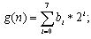 對數(shù)據(jù)作”值的轉(zhuǎn)換”的方法,其意思為:對要加密的檔案中的每一筆數(shù)據(jù),對它的內(nèi)容值作轉(zhuǎn)換。舉例而言,如果要加密的數(shù)據(jù)為一個(gè)圖文件,則此方法會(huì)對每一個(gè)像素作處理,并改變每一個(gè)像素的值。首先,其對每一個(gè)字節(jié)(byte)的值,拆開成為binary的形式,如式(1.1)所示,其中g(shù)(n)表示要加密檔案中的一個(gè)字節(jié),其中n=0,