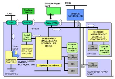 Controller (BMC)。它通過各別的界面來管理整個系統(tǒng),如系統(tǒng)狀態(tài)偵測及事件過濾、電源管理、記錄事件發(fā)生時間及系統(tǒng)回復控制,并且透過網(wǎng)絡或串行端口來告知管理人員,另外,它提供了IPMB的總線來和外部的管理控制器互相溝通。