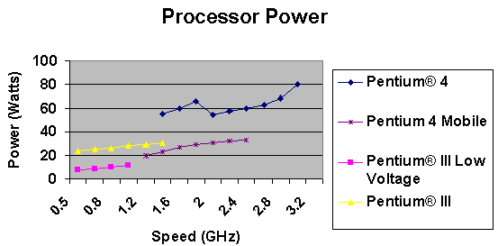 一個(gè)32W的功率讓一顆Pentium 4的處理器可以跑到1.7GHz,要增加處理器的速度則讓我們必須增加散熱片的大小,或是降低最大操作溫度、增強(qiáng)吹風(fēng),或者是這些方法中的某種組合。下一代的設(shè)計(jì)目標(biāo)會(huì)是達(dá)到3GHz的P4處理器,那表示我們必須要能處理65W的熱能。下一代的卡板由于將具備更加多樣豐富的功能與規(guī)格,勢(shì)必難以在增加散熱片大小上做文章,多出來的33W將必須通過增加風(fēng)速和降低最大操作溫度來達(dá)成。每分鐘450英尺的風(fēng)速,散熱片熱阻0.45°C/W,周邊操作溫度可被降到40°C。如果給定這樣的條件,處理器最大的功率將是