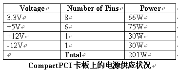 CompactPCI卡板透過J1/J2的連接器來接收電源。有8個(gè)3.3V、6個(gè)5V、1個(gè)+12V、1個(gè)-12V的電源接腳。這些接腳供應(yīng)1安培 IEC61076-4-101規(guī)格的電。每個(gè)接腳一安培的限制是保守的,而且某種程度上會(huì)誤導(dǎo)讓人以為所有的接腳可以在周邊溫度70°C的狀況下去接一安培的電流。在現(xiàn)實(shí)狀況中并不是所有連接器中的接腳都負(fù)載到最大的電流量,事實(shí)上大部分的CompactPCI接腳都是負(fù)載在以毫安為單位的電流范圍中。70°C一安培的限制,是基于流過接腳的電流所產(chǎn)生的熱。當(dāng)電流增加時(shí),也加大了跨過接腳的電位差。產(chǎn)生的熱是一種電壓和電流的函數(shù),電壓和電流的增加會(huì)使連接器接腳的溫度上升。在CompactPCI中有最顯著電流量的的接腳,是電源供應(yīng)器接腳。如果設(shè)計(jì)者假設(shè)J1/J2連接器中的其它所有接腳都有電流負(fù)載,每一個(gè)接腳的最大電流則會(huì)是在40°C 2.5Amps, 這個(gè)信息可以在IEC61076-4-101的規(guī)格中的4.2.3中被找到。在每個(gè)接腳2.5安培的條件下,板卡可取得的功率大小如下表所示,此表顯示出卡板的設(shè)計(jì)者最多可以從J1/J2連接器中拉出200Watts的電。