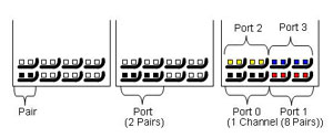 接口的最小連接單元。端口的兩對差分信號被映像成一收一發(fā)的傳輸模式。下圖描繪了一個差分對、一個埠、以及一個通路的針腳分布: