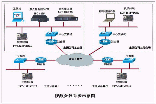 整個(gè)系統(tǒng)采用星型結(jié)構(gòu),便于視頻會(huì)議系統(tǒng)的開(kāi)發(fā)商進(jìn)行C-S模式的開(kāi)發(fā)。采用集中式管理,便于系統(tǒng)的擴(kuò)展。任何一個(gè)個(gè)分會(huì)場(chǎng)的線路出現(xiàn)故障,不影響整個(gè)系統(tǒng)的運(yùn)行。在整個(gè)系統(tǒng)平臺(tái)上還可以做其他多媒體應(yīng)用的開(kāi)發(fā),方便用戶進(jìn)行系統(tǒng)功能的拓展。