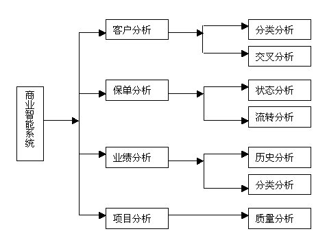 通過(guò)商業(yè)智能可以實(shí)現(xiàn)對(duì)客戶(hù)分析、保單分析、業(yè)績(jī)分析和項(xiàng)目分析等各項(xiàng)內(nèi)容進(jìn)行管理分析。它包含5個(gè)決策分析模型以及超過(guò)60種的商業(yè)智能分析報(bào)表,內(nèi)嵌式數(shù)據(jù)挖掘模型與決策分析報(bào)表為電話(huà)營(yíng)銷(xiāo)管理人員提供了有力的分析工具,對(duì)于銷(xiāo)售管理起到了定量分析、定性決策的重要支撐作用,支持不同層次的管理者進(jìn)行不同范圍的決策。其系統(tǒng)架構(gòu)圖如下: