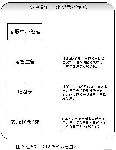 關于團隊的建設,應該首先考慮組織架構的設立。從運營角度講,設置客服中心經理、運營主管、班組長、客服代表都是必須的。當然根據(jù)不同的規(guī)模,也可以增加或者減少層級。具體建議請見圖2所示。除了運營之外,對于大型呼叫中心(50坐席以上,或者業(yè)務較為復雜的),也應考慮相關部門的設立。比如客戶關注組,可以負責疑難問題解決、工單流轉、投訴處理、建議處理、知識庫建設采編等等;培訓組可以負責管理、組織、實施員工培訓;技術維護組可以負責系統(tǒng)維護、網(wǎng)絡維護、新項目應用界面開發(fā)、部分系統(tǒng)優(yōu)化;綜合行政可以負責人事、行政等事務。