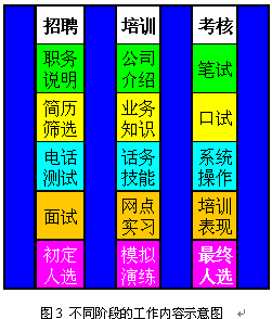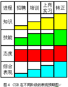 即使經過規(guī)范的上崗培訓與考核,新員工通常也只達到老員工70%左右的表現(xiàn)。因此制定明確的實習期,在實習期間加強指導和培養(yǎng)是非常重要的。通常經過3個月的實習,新員工已經可以達到一個標準,這時便可以轉正了。圖3和圖4表現(xiàn)了不同階段對CSR的不同預期,以及不同階段的主要工作。