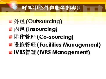 看到外包的話,有一些是發(fā)包商或者是承包商。我希望有一些原因讓大家可以降低成本,希望客戶可以專注它的可信業(yè)務(wù),然后客戶不具備這些技能人才,或者是呼叫中心的管理人員,F(xiàn)在是呼叫中心管理人員招聘是非常的困難的。大家可能是呼叫中心的運(yùn)營者,有沒有?在呼叫中心里面做管理工作的,有沒有?沒有。呼叫中心里面招人很難,但是在外包呼叫中心招人更難。因?yàn)檫@個(gè)要求比呼叫中心更難,不然人家不可能把外包給我們。雖然是這樣,據(jù)統(tǒng)計(jì)可能是超過60%以上的客戶是為了降低成本才外包出來的,但是在一個(gè)成熟的市場,他們不單單因?yàn)檫@個(gè)原因。而我們?cè)谙愀鄣倪\(yùn)營中心,廣州的國內(nèi)運(yùn)營中心是比較年輕的,還沒有成為一個(gè)成熟的體系。在香港十幾年了,在外包行業(yè)相對(duì)比較成熟的話,往往不是因?yàn)槲覀兂杀镜,它還有更高的要求。它還有另外一個(gè)外包的方式,所以我們現(xiàn)在處于慢慢去提升、我們提高外包成熟程度的一個(gè)階段。所以,另外還有一個(gè)是希望通過外包提升靈活性,共享一些自建的資源。比如說剛才說的在黑龍江,在大連,甚至于青島有一些BPO基地,有外包在那邊運(yùn)作,可能客戶更愿意把業(yè)務(wù)外包到資源比較豐富的基地里面做,改善水平,大規(guī)模的人力資源,流程創(chuàng)新等等這個(gè)是客戶服務(wù)的原因。