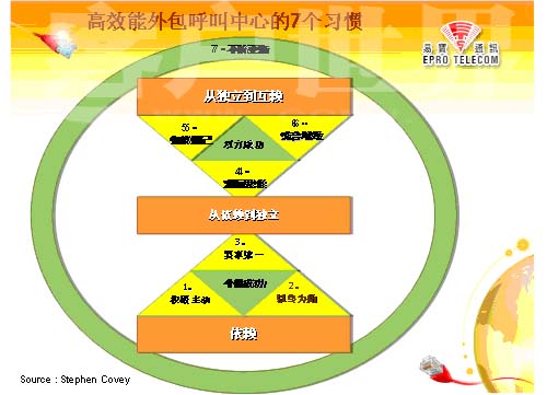 這個(gè)是我剛才說的高效能呼叫中心的7個(gè)習(xí)慣,一個(gè)是在個(gè)人管理的提升,也是因?yàn)槌隽诉@本書之后,我發(fā)現(xiàn)很多的課題,家庭管理習(xí)慣,小孩管理的習(xí)慣,所以我也套用在外包呼叫中心里面。