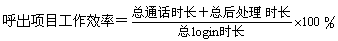 - 定義:呼出項目的工作效率是衡量呼出項目座席工作負荷率的主要KPI,一般指某段統(tǒng)計時間內(nèi),總處理時長與登錄系統(tǒng)時長的比率。對于沒有座席操作系統(tǒng)的呼叫中心可以將分母換成計劃工作時長。