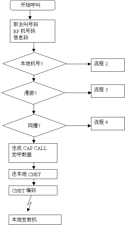 本地呼叫漫游到異地的本地機(jī)時(shí), 自動(dòng)臺(tái)通過(guò)PCM數(shù)字中繼, 從MFC信號(hào)中取到BP機(jī)號(hào)及主叫電話號(hào)碼, 或從用戶DTMF撥號(hào)中得到信息碼,形成發(fā)呼串送到發(fā)呼工作站,由發(fā)呼工作站形成CAP CALL 發(fā)呼串,發(fā)到漫游地自動(dòng)臺(tái),后面的呼叫過(guò)程就由漫游地自動(dòng)臺(tái)來(lái)完成。