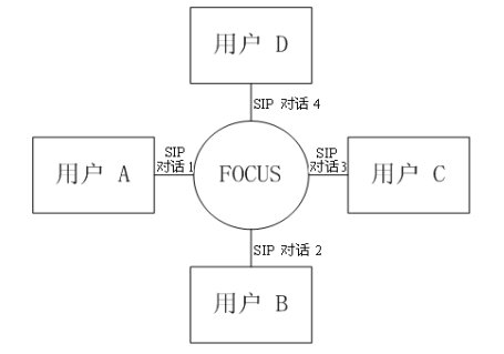緊耦合會(huì)議的邏輯架構(gòu)圖如圖三所示。會(huì)議中的核心是"會(huì)議中心(conference focus)",每一個(gè)會(huì)議都有一個(gè)會(huì)議中心,由一個(gè)URI標(biāo)識(shí),用戶通過聯(lián)系這個(gè)URI參加到一個(gè)會(huì)議中去。會(huì)議中心和用戶之間的拓?fù)浣Y(jié)構(gòu)為星性結(jié)構(gòu)。會(huì)議中心為用戶提供并維持一個(gè)信令連接,并且可以執(zhí)行會(huì)議策略,實(shí)現(xiàn)對(duì)會(huì)議的控制和管理。