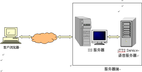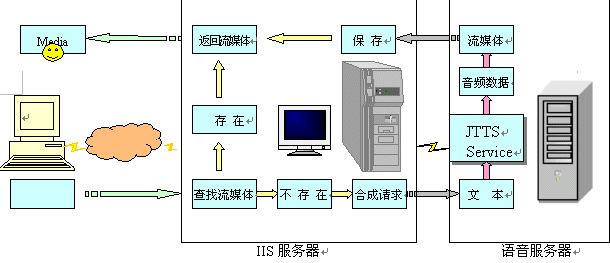 語音服務器方案是指利用捷通華聲在CTI領(lǐng)域成熟應用的jTTS Service語音服務器,增加一臺或多臺語音服務器到現(xiàn)有的IIS服務系統(tǒng)的網(wǎng)絡環(huán)境中;在IIS服務器中,增加訪問語音服務器的功能。當IIS服務器需要流媒體輸出時,向語音服務器發(fā)出請求,語音服務器接受IIS服務器的請求,并對請求的數(shù)據(jù)進行合成、格式轉(zhuǎn)換,得到流媒體后返回給IIS服務器,IIS服務器再將此流媒體傳輸給用戶。