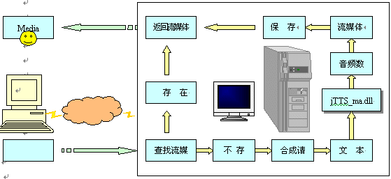 瀏覽器端(Explorer)發(fā)出瀏覽請求,網(wǎng)站服務器(IIS)根據(jù)請求查找流媒體(音頻流)文件,如有,則將流媒體返回客戶端,并啟動客戶端的MS media player播放流媒體。若沒有,則向語音服務器(jTTS Service)發(fā)出合成請求,并將所需合成的文本通過Socket接口傳送至語音服務器;語音服務器響應網(wǎng)站服務器的合成請求后,將調(diào)用jTTS合成技術(shù)進行語音合成,并調(diào)用WMF SDK將生成的音頻文件轉(zhuǎn)換成流媒體格式ASF;通過Socket接口返回IIS服務器端后,將此流媒體文件存儲到指定的Web目錄,同時將流媒體返回瀏覽器端,啟動MS media player播放。其流程如下: