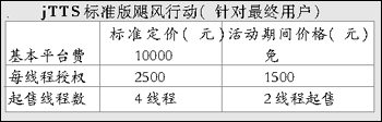 jTTS標準版在聲音質(zhì)量、聲音平滑度、自然度等方面已具有比較高的實用化水平。為了真正啟動語音技術(shù)的應用市場,捷通華聲啟動“颶風行動”,在活動期間為最終客戶、系統(tǒng)集成商制定了一個極具競爭力的價格,并且無平臺費。這次活動主要針對CTI領(lǐng)域中大量中小型系統(tǒng)的應用開展此次活動,目的是讓先進的技術(shù)能夠被更多的用戶采用,為系統(tǒng)集成商應用TTS技術(shù)提供了很高的利潤空間。