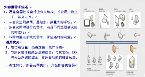 太平洋保險(xiǎn)集團(tuán)下根據(jù)業(yè)務(wù)模式劃分為產(chǎn)險(xiǎn)、壽險(xiǎn)2個(gè)公司,每個(gè)公司在全國(guó)各省都有分公司,目前集團(tuán)公司管理著主服務(wù)器,每個(gè)分公司都有自己的從服務(wù)器,總計(jì)60余臺(tái)從服務(wù)器,應(yīng)用的交互點(diǎn)數(shù)1000點(diǎn),旁聽(tīng)點(diǎn)數(shù)300點(diǎn)。保險(xiǎn)行業(yè)銷售人員流動(dòng)快、各種培訓(xùn)頻繁、新險(xiǎn)種推出層出不窮,其中省分公司、眾多支公司與銷售網(wǎng)點(diǎn)人員的即時(shí)音視頻交流是重中之重,為了滿足客戶要求系統(tǒng)平臺(tái)支持大容量會(huì)議人數(shù)、多會(huì)議同時(shí)召開以及流暢的音視頻交換的要求,國(guó)際視訊知名廠商北京威速科技有限公司專門為大企業(yè)級(jí)用戶開發(fā)出了高性能大容量的視頻會(huì)議產(chǎn)品。這種更適用組織機(jī)構(gòu)龐大、更穩(wěn)定的純軟件網(wǎng)絡(luò)視頻會(huì)議平臺(tái),是迄今為止業(yè)內(nèi)唯一勝任單會(huì)議室同時(shí)容納千人以上用戶開會(huì),并支持無(wú)限量會(huì)議室,并且通過(guò)級(jí)聯(lián)技術(shù)可以同時(shí)支持幾千路音視頻交互并發(fā),同時(shí)實(shí)現(xiàn)一個(gè)集視頻交互、音頻交互、屏幕廣播、遠(yuǎn)程控制、文字交流、電子白板、文檔共享、文件傳輸?shù)榷囗?xiàng)功能于一體的綜合多媒體遠(yuǎn)程會(huì)議平臺(tái)。自V2 conference應(yīng)用以來(lái),承擔(dān)了公司絕大部分遠(yuǎn)程交流任務(wù),太平洋保險(xiǎn)集團(tuán)已把視頻會(huì)議交流當(dāng)作工作的一部分,成為工作之必須的習(xí)慣。極大地提高了企業(yè)運(yùn)作效率、降低了成本,而這些正是金融保險(xiǎn)機(jī)構(gòu)的制勝之道。