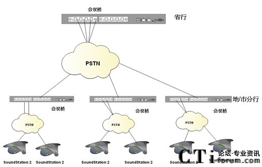 根據(jù)客戶需要在降低會(huì)議成本的前提下實(shí)現(xiàn)快速、便捷、實(shí)時(shí)的多點(diǎn)之間多人會(huì)議溝通的需求,我們制定了以下解決方案;系統(tǒng)利用傳統(tǒng)電話網(wǎng)絡(luò),是客戶擁有自己的會(huì)議管理系統(tǒng);省行方面使用Polycom SS2基本型商務(wù)會(huì)議電話或普通模擬電話;各個(gè)市/縣級分行,根據(jù)自己會(huì)場的情況自選設(shè)備;