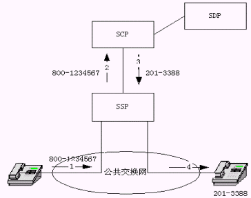 該圖示業(yè)務(wù)工作過(guò)程如下:(1)主叫用戶撥800號(hào)號(hào)碼,(2)SSP向SCP查詢800號(hào)號(hào)碼,(3)SCP查詢數(shù)據(jù)庫(kù)后向SSP送回譯碼結(jié)果(真正被叫號(hào)碼),(4)SSP連接主、被叫,振鈴。