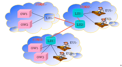圖中的紅線是TRIP協(xié)議控制下的各個域中網(wǎng)關路由信息在LS之間被聚合、被交換、被廣播、被同步的路徑。各個ITAD管理者首先簽訂適用于交互網(wǎng)關信息的TRIP協(xié)議,然后通過管理手段建立起這些信息共享的聯(lián)合體,一個域中的LS同其它域中的LS都成為聯(lián)合體的一員,于是這些LS通過這種方式就可以交換網(wǎng)關信息了。在圖中,ITAD1的LS1與ITAD2的LS1相連,ITAD2的LS2又依次與ITAD3的LS1相連通,通過TRIP協(xié)議,ITAD2的LS2就可以了解ITAD1上的兩個網(wǎng)關,這兩個網(wǎng)關的網(wǎng)關路由信息就可以由ITAD2的終端用戶通過其前端(front-end)進行訪問。在ITAD3中,既有終端用戶,又有網(wǎng)關,ITAD3的LS1通過ITAD2上LS2已經(jīng)聚合后的廣播消息來了解ITAD1上的網(wǎng)關。