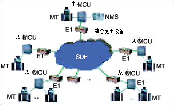 多點視頻會議系統(tǒng)主要由視聽多媒體會議終端MT、通信傳輸網(wǎng)絡(luò)SDH、網(wǎng)絡(luò)節(jié)點的多點控制單元MCU、網(wǎng)絡(luò)管理系統(tǒng)NMS以及外圍設(shè)備等幾部分組成。由于通信網(wǎng)絡(luò)不同,會議電視系統(tǒng)的終端和多點控制單元MCU也不盡相同。例如,對于采用電路交換通信網(wǎng)絡(luò)的多點會議系統(tǒng)通過MCU實現(xiàn),而包交換通信網(wǎng)絡(luò)則通過多點會議服務(wù)器來實現(xiàn)多方會議。如圖: