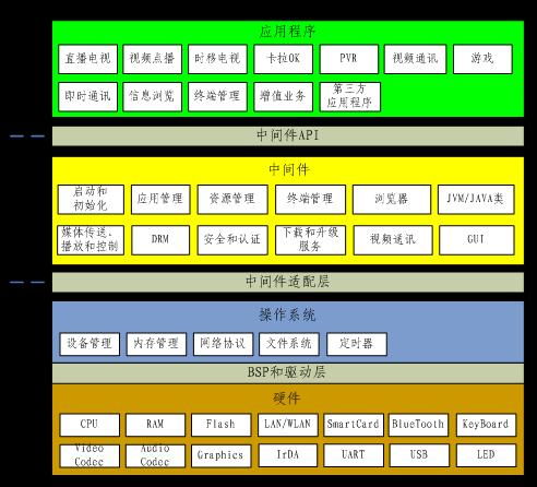 中間件標(biāo)準(zhǔn)化相應(yīng)應(yīng)該做到API接口標(biāo)準(zhǔn)化;業(yè)務(wù)應(yīng)用標(biāo)準(zhǔn)化,這里主要側(cè)重機(jī)頂盒的業(yè)務(wù)能力,因?yàn)椴煌瑥S家、不同客戶或者網(wǎng)絡(luò)發(fā)展不同階段,它需要的中間件功能是不一樣的,應(yīng)該是能力的展現(xiàn);再一個是平臺的適配。