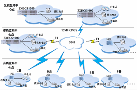 其它各接入節(jié)點(diǎn)采用IAD設(shè)備接入到ZXECS 1000,最大程度的降低了語音接入的成本,同時(shí)IAD靈活的擴(kuò)展性利于今后的升級(jí)。