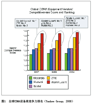 All-IP上的領(lǐng)先地位的進(jìn)一步鞏固,中興通訊已經(jīng)成為全球CDMA的領(lǐng)導(dǎo)者, Yankee group 2008年的一份咨詢(xún)報(bào)告顯示,中興通訊CDMA綜合排名穩(wěn)居全球第一集團(tuán)行列(見(jiàn)圖1)。