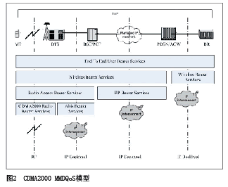如圖2, CDMA2000 MMD QoS模型是由終端、接入網(wǎng)絡(luò)和核心網(wǎng)絡(luò)共同保證。終端和無(wú)線(xiàn)接入網(wǎng)之間的空中接口定義相關(guān)的QoS服務(wù)參數(shù)和級(jí)別;在無(wú)線(xiàn)接入網(wǎng)BSC和PCF之間的A8接口以及PCF和PDSN/AGW之間的A10接口上分配滿(mǎn)足用戶(hù)已被授權(quán)的QoS要求的資源;核心網(wǎng)提供在PDSN/AGW和邊界路由器(BR)之間的QoS服務(wù)。